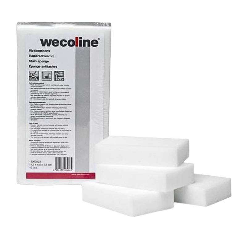 De Wecoline Melamine Vlekkenspons 10 stuks is een krachtige schoonmaakspons waarmee hardnekkige vlekken en vuil eenvoudig verwijderd kunnen worden zonder gebruik van schoonmaakmiddelen. Dankzij de fijne structuur van het melamineschuim werkt de spons als een microfijne schuurpad die vuil, strepen en aanslag effectief van verschillende oppervlakken verwijdert. Met alleen water maak je oppervlakken weer schoon en fris.