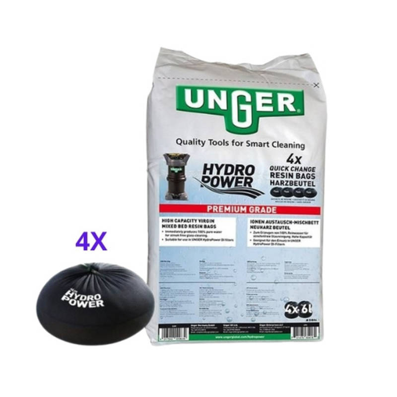 De set bestaat uit vier voorgevulde harszakken van elk 6 liter, ontworpen voor snel en schoon wisselen zonder morsen. Het waterdoorlatende textiel maakt het vervangen eenvoudiger en sneller dan bij traditionele DI-systemen. Per vulling kan circa 1.200 liter 100 % zuiver water worden geproduceerd bij gemiddelde waterhardheid. De harszakken zijn geschikt voor alle Unger HydroPower DI-filters, met uitzondering van de HydroPower Ultra, en zijn in ongebruikte toestand onbeperkt houdbaar.